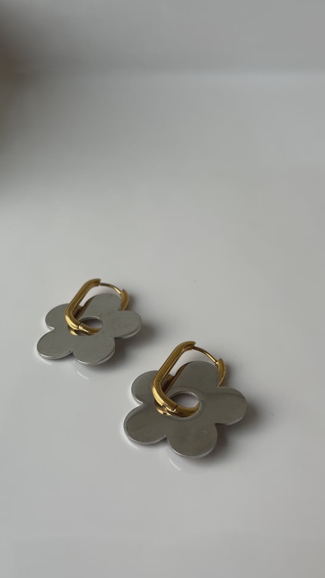 Het contrast tussen de gouden rechthoekige ring en de glinsterende zilveren bloem zorgt voor een opvallende visuele impact. Versier je oren met deze statement-oorbellen die een delicate en eigentijdse stijl weerspiegelen.